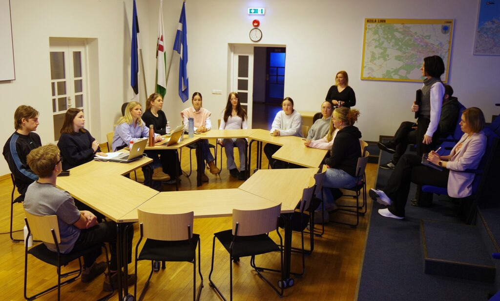 Keila linnavalitsuse saalis toimus Noortevolikogu koosolek. Kokkusaamisele olid kutsutud ka linnapea Keiu Valge (paremalt teine) ja abilinnapea Anneli Pärlin (paremal).